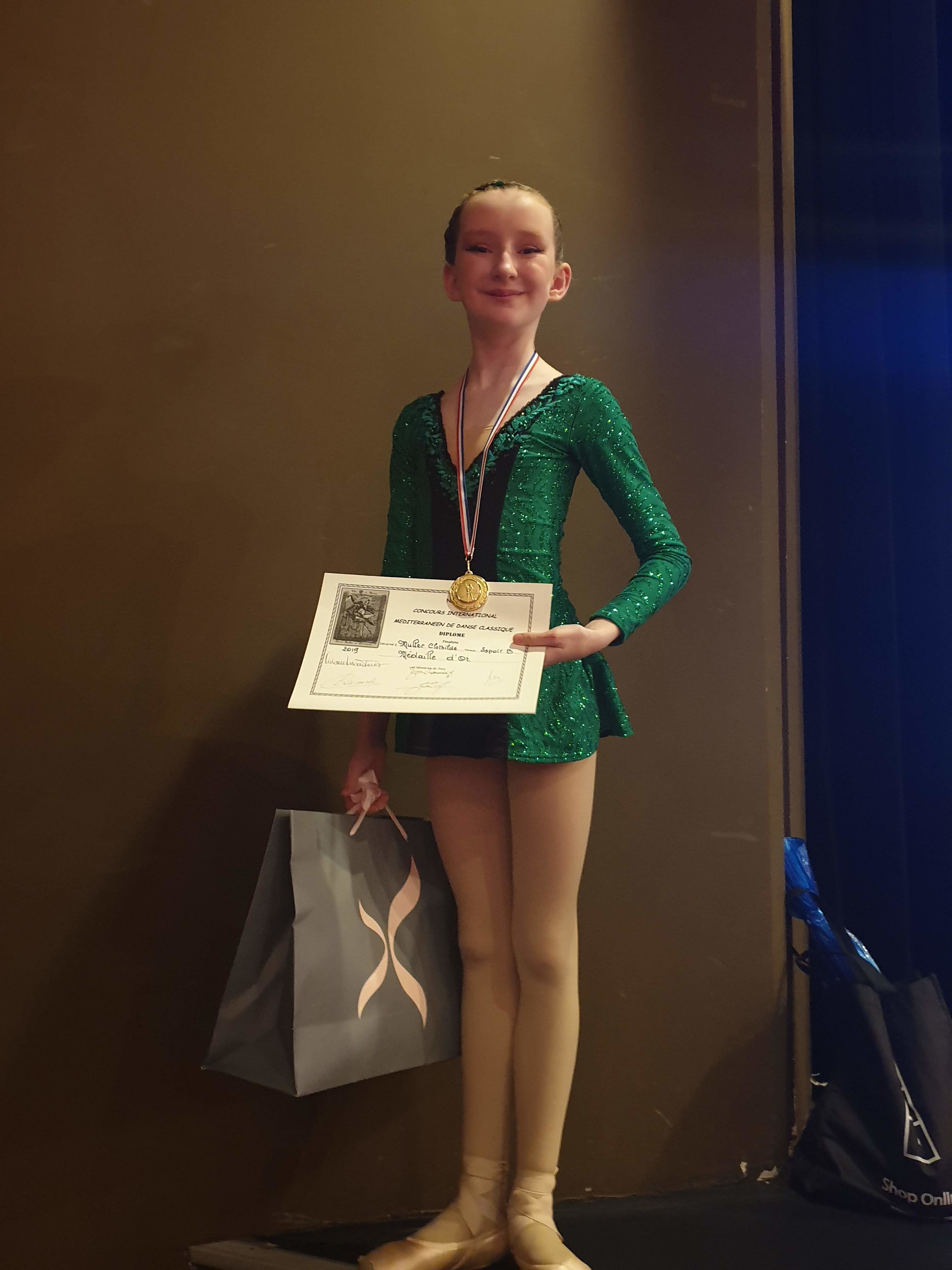 Médaille d'Or au 23eme concours international de Nimes Clothilde MULLER Article du Midi Libre : https://www.midilibre.fr/2019/12/16/clothilde-muller-une-danseuse-en-or,8606818.php Prev Next